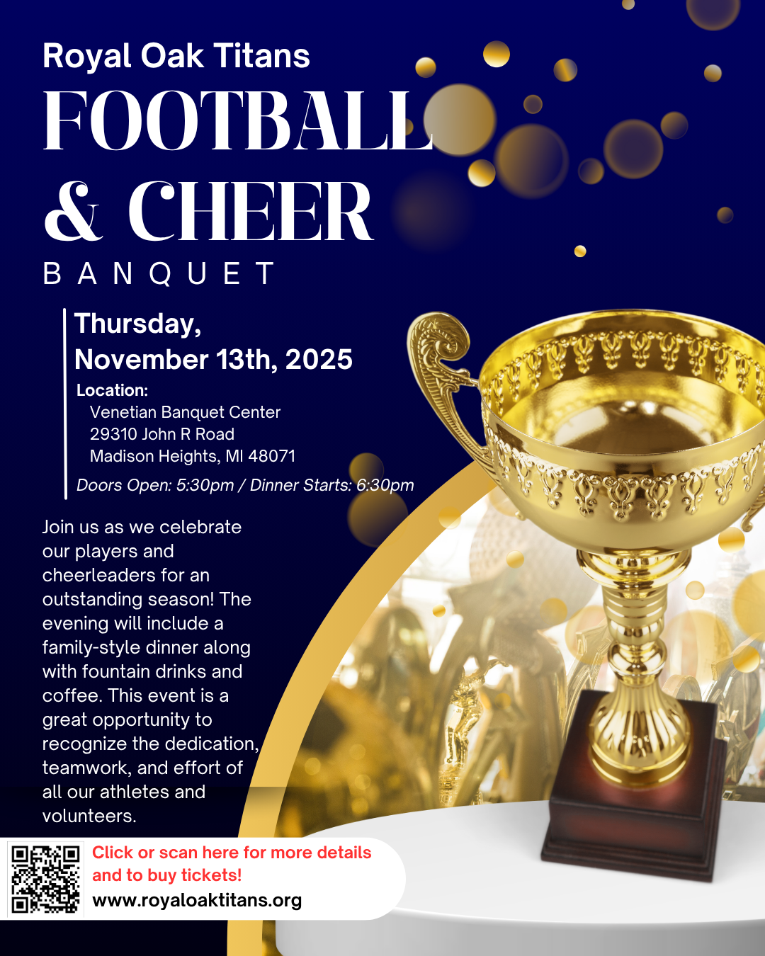 Royal Oak Youth Football Teams, also known as the Royal Oak Titans, is an all-volunteer organization that is committed to helping young athletes develop football and cheer skills in a positive and safe environment. We focus on teamwork, integrity, and building confidence. Royal Oak Football Teams is a registered 501 (c)3 non-profit organization that Royal Oak youth have participated in since 1955 in the Jack E. Lother Little Football League. ROYFT, in one form or another, has operated football and cheer teams for almost 70 years and has a long and proud history of having multiple teams, at one point fielding eight teams from Royal Oak. Our organization promotes sportsmanship, dedication and team work, all in a family fun environment. Each year, as an organization we have the privilege of helping over 200 boys and girls from the ages of 5-13 to learn to participate and compete in either football or cheer.